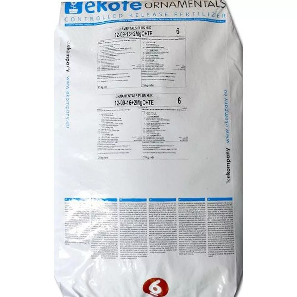 Az Ekote Ornamentals Plus Hi K 6 hónapos káliumos változata kiváló a leggyakrabban termesztett cserepes dísznövények számára. Folyamatos tápanyagszintet biztosít az egész tenyészidőszakban. Teljes körű makro- és mikroelem tartalom jellemzi. Hatástartalom: 5-6 hónap. Kissé magasabb nitrogéntartalommal rendelkezik a sötétebb levélszín érdekében. Alacsonyabb foszfortartalommal bír a megnyúlás elkerülése, a kálium jobb hasznosulása érdekében. A magasabb káliumtartalom könnyebben felvehető káliumforrást biztosít a kompakt növekedés érdekében.