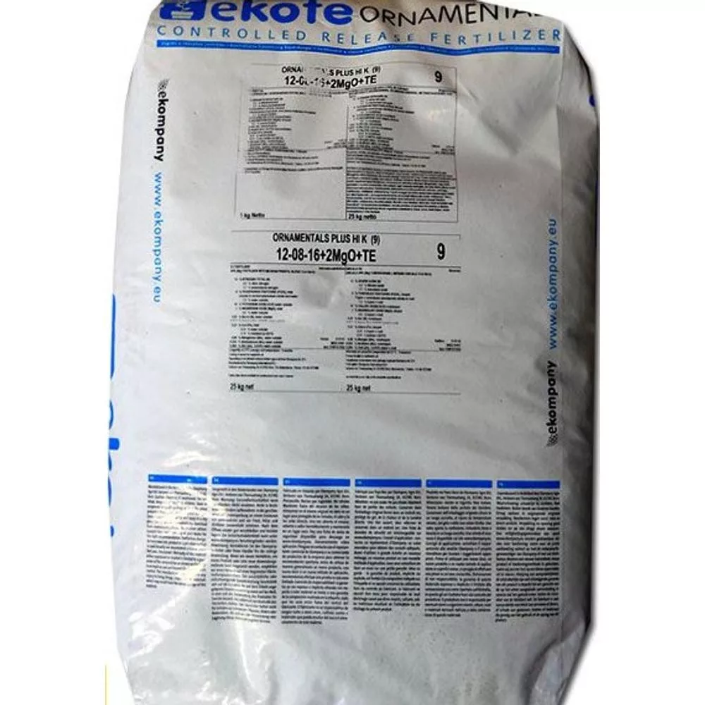 Az Ekote Ornamentals Plus Hi K 9 hónapos káliumos változata kiváló a leggyakrabban termesztett faiskolai és cserepes dísznövények számára. Folyamatos tápanyagszintet biztosít az egész tenyészidőszakban. Teljes körű makro- és mikroelem tartalom jellemzi. Hatástartalom: 8-9 hónap. Kissé magasabb nitrogéntartalommal rendelkezik a sötétebb levélszín érdekében. Alacsonyabb foszfortartalommal bír a megnyúlás elkerülése, a kálium jobb hasznosulása érdekében. A magasabb káliumtartalom könnyebben felvehető káliumforrást biztosít a kompakt növekedés érdekében.